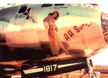 | Works of art have decorated the weapons of war down through the ages. In my own observations, during WW II and the Korean War, the artistry of military men and women flowered to new heights in the decorations painted on military aircraft. However that practice flourished in wartime, it seemed to fade quickly with a war’s end. During the Korean War, nose art flourished in the 91st SRS; yet, when my crew arrived at Yokota in the Fall of 1953, we saw no evidence of nose art on any of the aircraft in the unit.