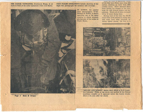Daily thereafter, these planes went deep into enemy territory on photographic, reconnaissance, and surveillance sorties. Daily they reported to higher ground and air headquarters the disposition of enemy troops and supplies, movements of enemy forces, weather conditions, sea travel and other intelligence information which assisted United Nations commanders to virtually forecast the enemy's every step. Since the start of hostilities, crews of the 31st have flown more than 250 sorties, stacking up more than 2800 combat hours. Their missions have been among the longest of the war, with 15 and 16-hour flights not uncommon. Nearly all of them averaged 10 to 12 hours flying time. During most of the time the RB-29 crews have been subject to enemy fire and some have been attacked by enemy fighter planes. On November 9, a tailgunner, Cpl Harry J. Lavene of St. Louis, Mo. shot down a MIG-15 when a flight of enemy jets attacked his RB-29. He thus became one of the first airman to score on the prized MIGs. He was later decorated with the Distinguished Flying Cross. After the first FEAF Bomber Command attacks on Wonsan, low hanging clouds hindered photographic efforts for several days. Finally a 31st Superfortress flown by Lt. Earle Ambrose of Greenville, S.C., roared down to 1500 feet and skimmed over the city to make pictures, drawing enemy fire from the city and nearby hills. On Aug. 27, Lt. Earl Myers of Grand Island, Neb. and his crew spotted 90 tanks in one area a few miles west of Hamhung. Fighters and light bombers roared in to bring the concentration under attack. Photographs taken the next day revealed a major part of the tank force destroyed. Flash reports from crews of the 31st played an important part in helping stem the flow of troops and supplies from across the border into Korea in September. On Sept. 16, Maj. Robert T. Ray of Little Rock, Ark. and his crew spotted 200 vehicles moving to the battle front. Air support was moved in quickly after the flash report to strafe, bomb, and rocket the vehicles. It was a lone RB-29 from the 31st, flown by Lt Robert T. Ebey of Topeka, Kans. that took the first photographs of Sinuiju, Korean city on the banks of the Yalu River and twin city on the Manchurian border. A flash report from Ebey on Nov. 1 disclosed the presence of more than 50 enemy airplanes on the field there. A few hours later, flight after flight of F-80 and F-51s of the Fifth Air force raked the field with rockets and .50 caliber machine gun bullets and left the enemy air concentration broken and burning. Still another RB-29 from the 31st, piloted by Lt. David L. Muller of New York City, hovered low over the Communist stronghold of Kanggye on Nov. 5, while high above, other B-29s from FEAF Bomber Command rained thousands of fire bombs on the supply center and communications hub. The following day, "before and after" photos of Kanggye were spread over the desks of intelligence and operations officers at FEAF Bomber Command and FEAF for analysis of damage inflicted. The same thing happened early in the war before and after strategic strikes on the Wonsan oil refinery, the Konan munitions and chemical complex, the Seoul bridges, important marshaling yards and more recently in the fire bombing of 18 resupply centers in far North Korea near the international border, and the Shinuiju bridge complex. In all these cases the 31st Strategic Reconnaissance Squadron crews photgraphed the targets prior to missions and after bombs were dropped. The squadron was in the Far East theater - at Okinawa - when the war broke out. It was in action four days later. It has been functioning ever since, under the command of Lt. Col. Edward D. Edwards of Altadena, Calif. and with a cloak of necessary secrecy wrapped around it. Reconnaissance made it possible to destroy military targets with fire bombs, and leave untouched homes and hospitals in the same general area. The industrial area of Konan was obliterated, while workmen's houses nearby were left untouched. Such precision bombing is made possible by accurate reconnaissance furnished by the 31st - until now an anonymous air element engaging in extremely dangerous operations high in the air over enemy territory."