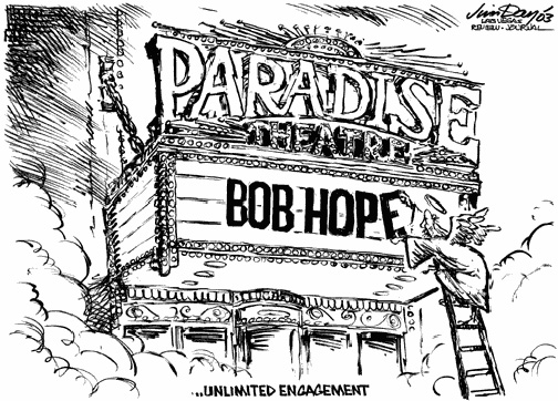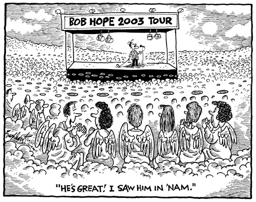 When our Creator brought Bob Hope into the World he had a lot of work for him to do. Is it any wonder that He gave Bob a hundred years to get the job done? Bob's accomplishments have been well accounted for in various local and national media. We have been reminded of his multitude of good works as our Nation mourned his passing. Some of the most memorable and moving tributes to Bob have been created by our cartoonists. They do such a great job of putting human actions and emotions into such a meaningful and understandable form with their drawing pencil or pen in hand.