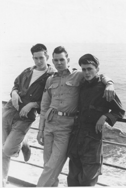 Within minutes of his remark, he just made it to the ship’s railing before he began his descent into hell. When he finished and looked back to us for a little sympathy, we all laughed and pointed are fingers at him. “_x23_%*$ you guys; you’ll get yours,” he moaned as he turned toward the railing again. “There are two things to do to keep from getting sick: stay topside as long as possible and eat every meal,” said the voice of authority whose name I’ve forgotten over the years. Maybe it was Archie…he was always making pronouncements. Bill Schuster, Don Nolan, Bob Wolfington, Bill Sutton, and I took it as gospel. The only one of the group to seriously succumb to motion sickness was Bill Sutton. He would faithfully eat every meal and, just as faithfully, he would find himself bending over the rail. Nary a man was more faithful to Archie’s admonition than Bill Sutton …it just didn’t work for him. He took his poison like a man. Never complained. He would position himself against some pole or bulkhead, pull his poncho over his head, and stay there until it was time to eat again. We all admired his constancy. Bill Schuster had a short bout with barfing as did Don Nolan …but Bob Wolfington and I never did. To this day, I can’t understand why I escaped. The only time I came close to letting go was when the guy in front of me in the chow line barfed in his tray. For a split second, I thought “this is it.” But, the Fates were with me and I managed to keep things down. |