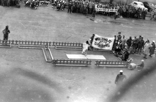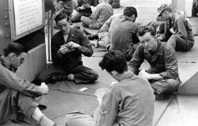 It was a long trip (17 days) in rough seas. We passed time creating and spreading rumours. Lots of the guys bit into the rumour that there would be a “mail plane meeting us at the half-way point in our journey.” Two or three V.D. lectures scared the hell out of all the younger guys. Snoozing on deck and watching an occasional movie helped morale. But it was the card games that provided the biggest diversion. Poker was out as everyone was broke so pinochle was king; and all the pinochle games were crooked. Guys developed elaborate signals to communicate the contents of their hands. Don Nolan and I were partners and had developed a fairly sophisticated set of signals. While in a game with Archie Gainey and his partner one afternoon, Archie accused us of cheating. “I don’t know how you are doing it, but if you little bastards “hit” each other’s cards in the next hand, I’ll throw these _x23_%*$ing cards overboard.” That’s exactly what he did as Don and I “hit” each other in the same suit the very next hand. We got on Archie’s case for a couple of minutes, accusing him of being a “poor sport” and denying that we cheated. He just stared at us for a minute, a big grin spreading across his face and “flipped us the bird.” Everyone laughed …so did we. Life went on. That’s exactly what he did as Don and I “hit” each other in the same suit the very next hand. We got on Archie’s case for a couple of minutes, accusing him of being a “poor sport” and denying that we cheated. He just stared at us for a minute, a big grin spreading across his face and “flipped us the bird.” Everyone laughed …so did we. Life went on. |